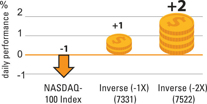 Take hold of your opportunity in a bear market. Inverse Products seeks to achieve an inverse daily return (-1x)/(-2x) of the benchmark's daily performance, before fees and expenses