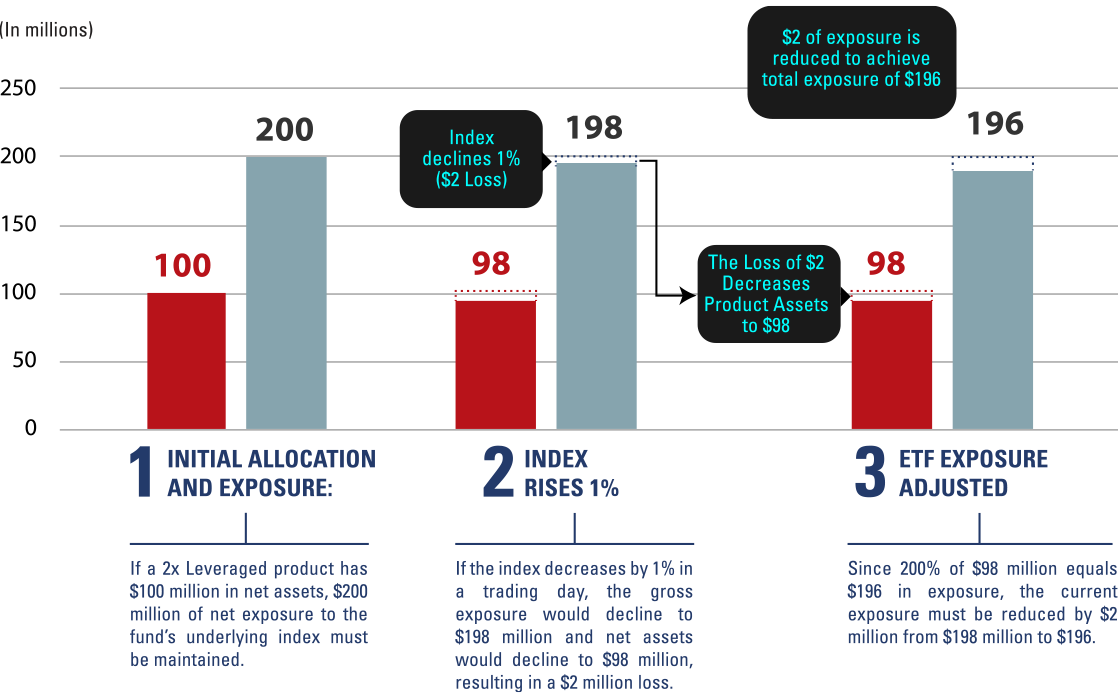Leveraged and Inverse products will conduct daily adjustment at or around market close, to ensure the product can maintain the exposure ratio.