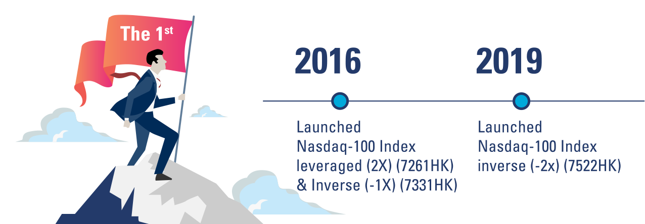 Provides comprehensive Nasdaq-100 Index ETF and Leveraged/Inverse Product Suites, ranging from physical ETF (3086 HK), leveraged (2x) (7261 HK), inverse (-1x) (7331 HK) to inverse (-2x) (7522 HK). This product series also allows trading in Asian time zones.