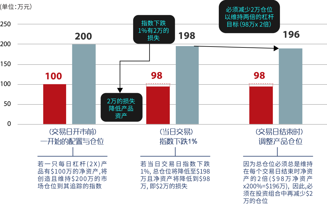 杠杆与反向产品通常于相关市场收市时或左右每日重整,以确保产品能每日维持接近所追踪指数正向2倍及反向1倍或2倍的每日表现。