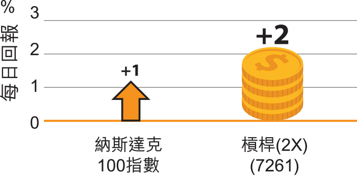 例如:華夏納斯達克100指數每日槓桿(2x)產品為例,如指數單日上漲1%,該槓桿產品就應提供2%的單日回報;相反,指數單日下跌1%,該槓桿型產品就會錄得2%的單日虧損。