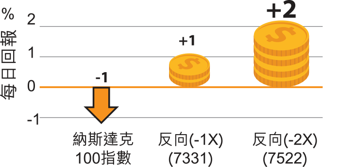 例如:華夏納斯達克100指數每日反向(-1x)及(-2x)產品為例,如指數單日下跌1%,(-1x)反向產品就會錄得1%的單日回報; (-2x)反向產品就會錄得2%的單日回報;如指數單日上升1%,(-1x)反向產品就會錄得1%的單日虧損; (-2x)反向產品就會錄得2%的單日虧損。