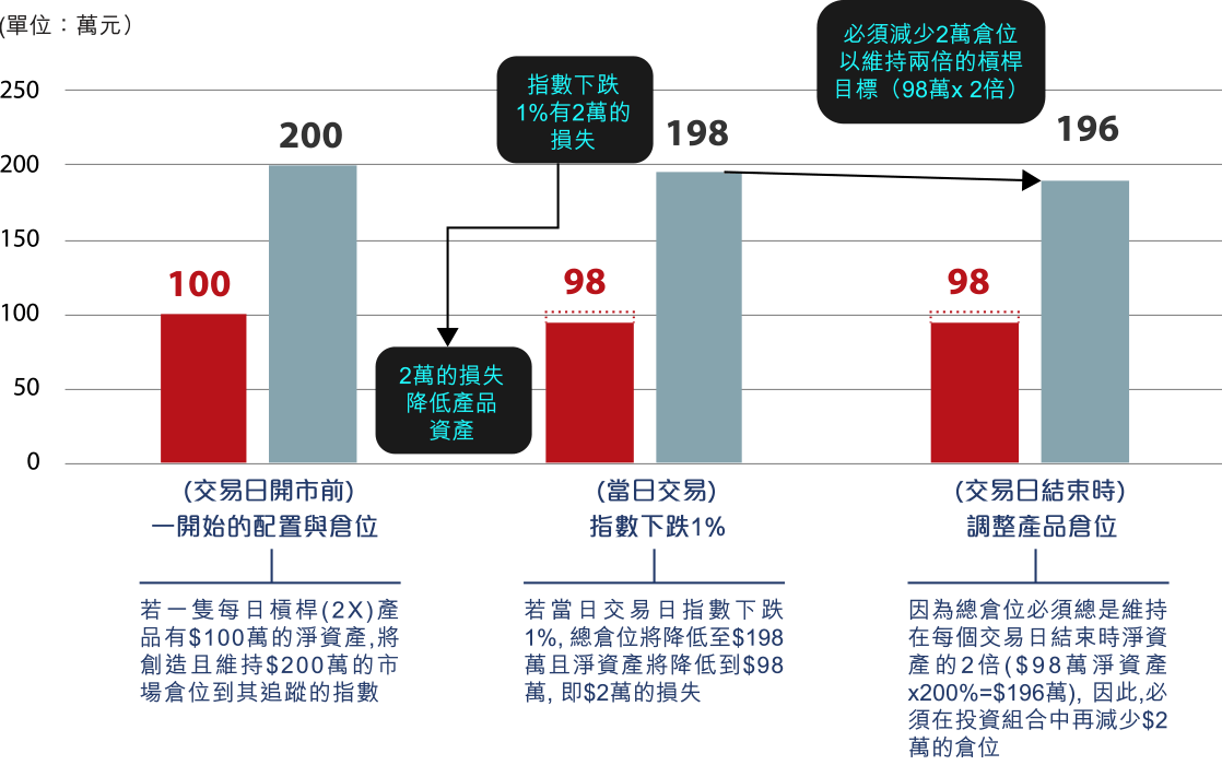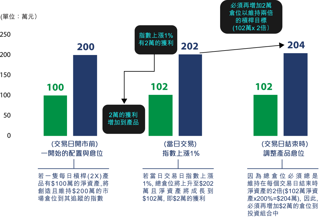 槓桿與反向產品通常於相關市場收市時或左右每日重整,以確保產品能每日維持接近所追蹤指數正向2倍及反向1倍或2倍的每日表現。